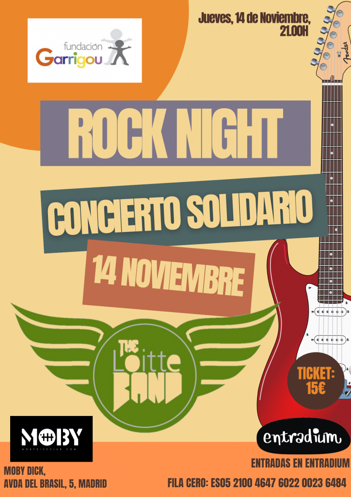 El próximo jueves, 14 de Noviembre, la sala Moby Dick de Madrid se llenará del mejor Rock gracias al concierto solidario que «The Loitte Band» ofrecerá a beneficio de la Fundación Garrigou. El fin es recaudar fondos para equipar el aula taller de Programas Profesionales Operaciones Básicas de Cocina.